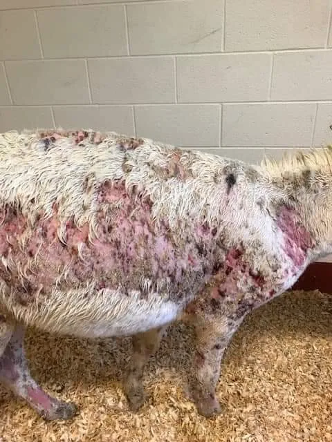 Savannah had to be kept out of the sun and bathed with medicated shampoo multiple times. Savannah healed very quickly, but unfortunately, lost her baby. Likely due to stress ans damage from her illness.