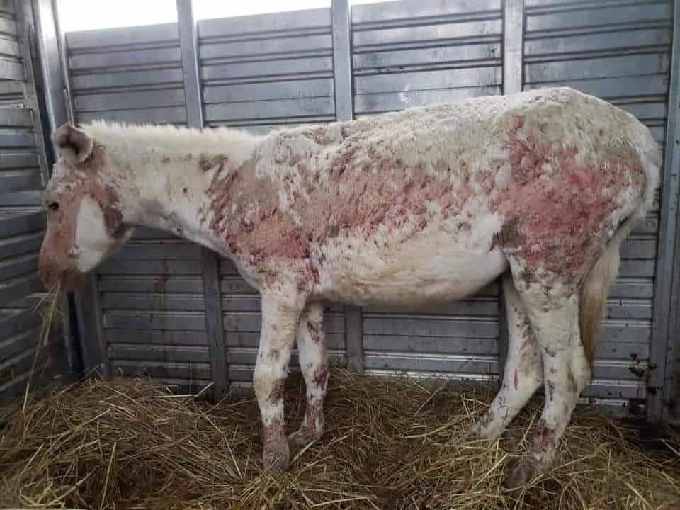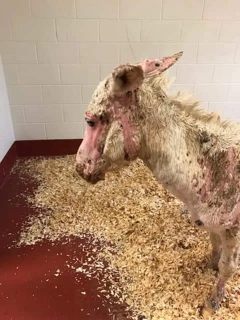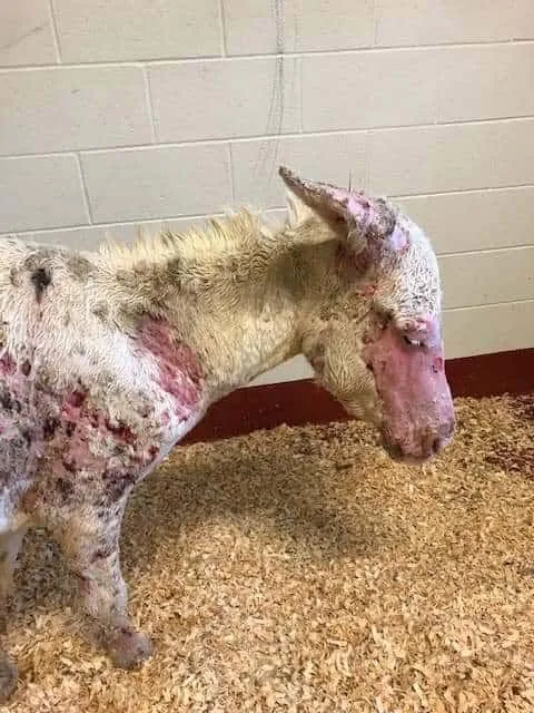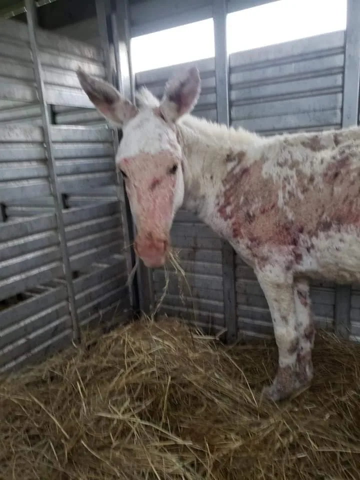 I received several urgent messages from TPDR supporters that there was a donkey owned by a MS kill buyer in need of urgent medical care. She had bald patches all over her body and was severely sunburned and had several skin bacteria and fungal infections. Our great rescue friend, Fran from Crossroads Donkey Rescue, helped us secure her and get her to the University of TN.